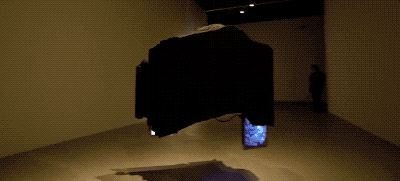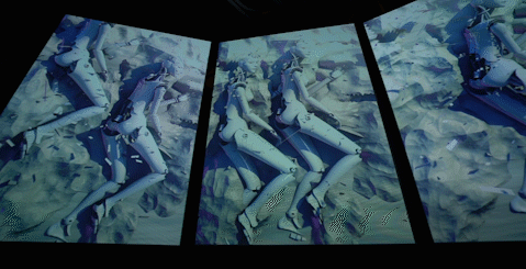三屏影像装置《有风的空间》在静态基础上进一步发挥,演变成动态连贯的动画影像,并被放大到颇为壮观的尺度。将机器视作人类身体的延伸,在数字世界虚拟的“风”中消散,也传递了林欣作为女性艺术家与生俱来的充满诗性的想象力。