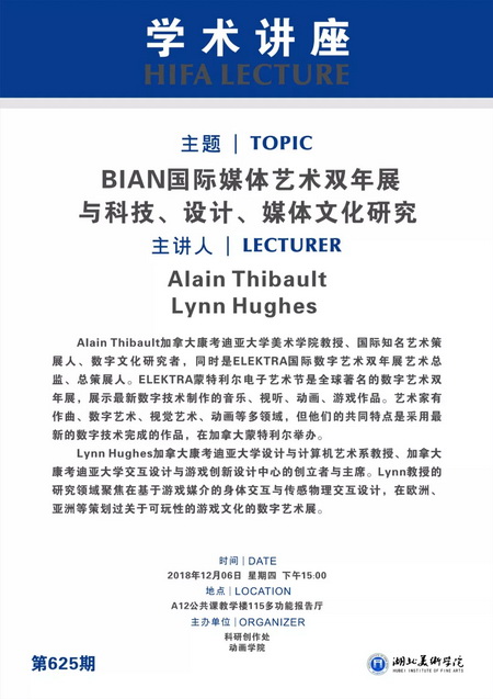 2018年12月6日,湖北美术学院以及date/MANA邀请,中国、加拿大两对艺术领域的夫妇介绍基于跨学科艺术创作的媒体艺术双年展策展思路、当下电子艺术的创作趋势与2018年相关展览作品;探讨在大学艺术学科建立科技、设计、艺术跨学科实验室的方法与经验讲解交互设计和互动艺术的相关创作案例与研究路径请你来参与一场double date的分享及对谈。