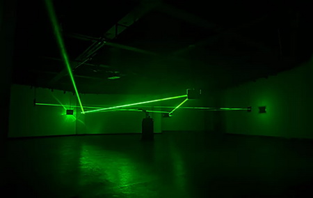 作品的出发点在于表现技术与人融合创造出的新物种,通过机械臂的运动来展示重复的运动和模仿的运动这两个主题,而两者在这一新物种上发生重叠所产生的变化,让这一新物种的“形貌”逐渐浮出水面。该作品将激光的射点作为具有指向性属性的机械臂的延伸,由镜子或棱柱的折射以及再折射使点对点的指向性具备随机和模糊的感觉。