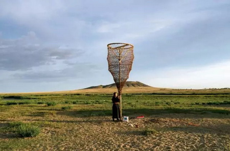 蒙冈塞特赛格·哈瓦苏伦,九位蒙古艺术家中的一员,在日出时举办了一场表演。她收集了一股股马鬃并将之拧成了绳子,然后编织成了一个大网。她在营地旁竖起了一根高高的杆子,然后将大网挂在上面,装饰成一个柔软的风向袋,随后出发走到距湖边五百米处。大量美丽而五彩斑斓的织物被编入网中,有人点起了粪火,产生一缕薄薄的白烟。蒙冈塞特赛格从湖边走来,靠着杆子摆出一系列宗教仪式的姿势。她绕着网在转,似乎让自己和网融为一体。这让她看起来像是在把自己与一个脆弱的文化绑在一起,来宣告自己的文化身份。