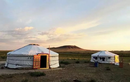 ▲夕阳下的蒙古包,后面是阿拉坦敖包火山(Altar Ovoo)