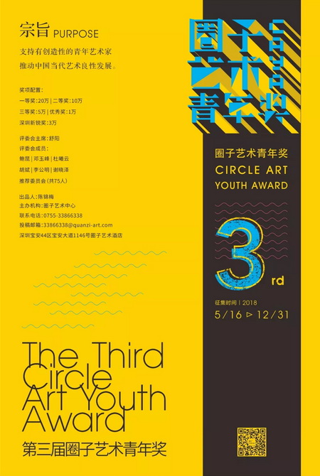 奖项:圈子艺术青年奖旨在支持有创造性的青年艺术家,推动中国当代艺术的良性发展,面向全国评选,每两年颁奖一次。