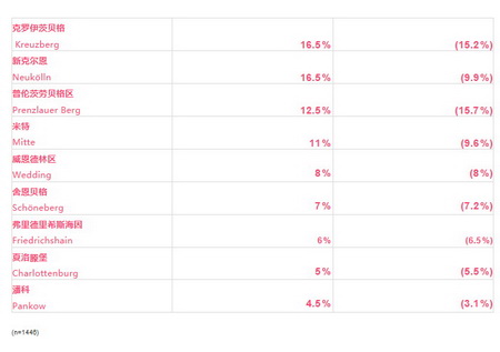 56%的艺术家居住在弗里德里希斯海因-克罗伊茨贝格,新克尔恩和潘科(包括普伦茨劳贝格区)地区。三分之一的人住在“Kreuzkölln”。简而言之,Prenzlauer Berg败给了Neukölln。87%的柏林艺术家居住在以下九个区(括号内为2011年的数据):