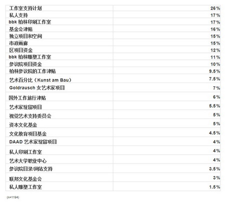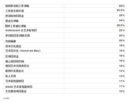 有10%参与调查的艺术家,国家支持占其总收入的 50%以上。 5%的受访者持续获得失业救济金或“Hartz IV(ALG II)”,其中5%是临时的,4.5%作为补充性金融福利( n = 1278)。对于我们调查中15%的艺术家,其他收入和贡献相当于其年度总收入的50%以上。 一般来说,艺术家收到的42%的支持是由他们的合作伙伴或家庭提供的(n = 596),其中5%得到家乡的支持,4.2%有金融赞助商。