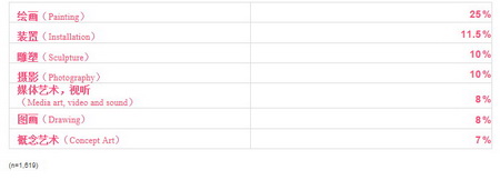 与2011年的研究相比,艺术实践形式的比例变化不大:40%与物体相关,27%是概念性的,7%是语言和表演的形式。男性艺术家的作品比女性艺术家的作品更注重客观,女性艺术家的作品更具表现性。总的来说两性的差异不大,甚至比上次调查还要小。在选择题中,女性和男性的比例也很接近,不过女性在雕塑和装置方面的工作稍多,男性在摄影领域工作更频繁。