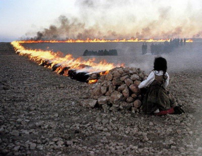 装置一旦到了室外,便与地景艺术难舍难分,同时更引入了行为表演和摄影摄像,这使装置不仅规模庞大,不仅具有综合性,而且在空间里获得了时间的持续与流动,赋予非叙事艺术以叙事的可能性。生于伊朗现居纽约的女艺术家西林·内夏特(Shirin Neshat,1957-)本从事摄影,但其摄影的内容,却是装置、地景、行为、表演的综合,而这一切,都是由她自己构思并导演的。在这个意义上说,这是她的室外大型装置作品,而且具有叙事的时间性。从文化研究的角度说,内夏特以其独有的艺术身份(女性、东方人、伊斯兰文化)而在作品中处理了他者(她者)、后殖民、少数族裔、多元文化等观念艺术的话题,探讨了冲突与接纳的主题。从理论概念的角度说,她刻意利用西方当代批评中有关“再现”、“凝视”等相关话语的所指,发挥了综合艺术的跨文化、跨时空特征,使自己的艺术主题得到了独到的视觉呈现。