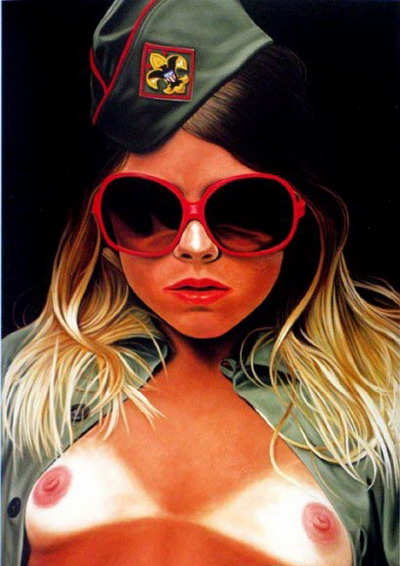 贯通这两者的另一位名声显赫的画家则是纽约黑人女画家卡娜·瓦尔克(Kara Walker,1969-)。她在美术馆展厅的巨大墙面上用幻灯投射的剪影效果,讲述黑人的故事,将通俗艺术与视觉叙事联系起来,开发了独到的艺术语言,而其观念性则在于重述历史,涉及画家对个人、家庭、族群、国家之历史关系的探讨。当代波普与半个世纪前流行的波普大不一样,纽约画家理查德·菲利普斯(Richard Philips,1962-)采用类似于照相写实的商业笔法,来处理通俗文化和社会题材。他笔下的裸女,分明是自以为是的傻女人,就像中国的芙蓉姐姐,却美其名曰“少先队员”(Scout),或者明明是妓女,却暗示为圣母。这种露骨的色情与尖刻的嘲讽,以一本正经的外观,既满足了观念艺术的要求,又迎合了大众和市场的口味,这是今日绘画中值得注意的现象。