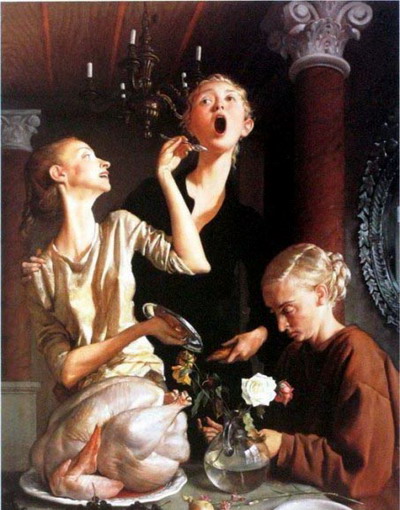 观念艺术与往日艺术的本质区别,是注重思想而相对轻视技巧。所谓思想,既是思考的内容,也指思维方式。在上世纪末的后现代时期,纽约最著名的观念画家马克·坦西(Mark Tansey,1947-)便以理性的具象绘画著称,其思考内容是哲学、美学与艺术理论,其思维方式和绘画方式是解构与反讽。在21世纪的头十年中,他继续了自己的艺术方式,没有发生大的改变,于是,理性绘画的教主地位便由新起的纽约画家约翰·柯林(John Currin,1962-)取代。柯林也以具象绘画著称,但他的思考内容转向了艺术史和当代社会文化,其思维方式和绘画方式是用貌似古典技法去戏仿欧洲古代大师的绘画,却反讽当代生活。这样的多重指涉,打乱了符号学中能指与所指的关系,以貌似循规蹈矩的画法,而达到了解构和颠覆的目的。柯林在上世纪末引起纽约艺术界的关注,21世纪初在西方世界变得大红大紫。
