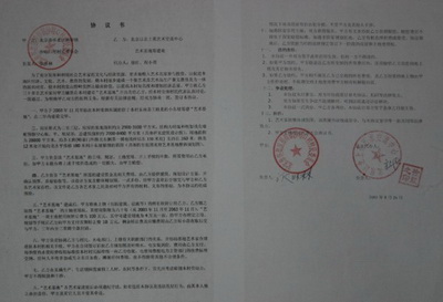2003年与怀柔区桥梓镇沙峪口村签订了合资兴建艺术家基地的《协议书》(如图),村委会承诺他们负责将一切土地及建设的相关手续办齐,我们只需要投资建设即可。