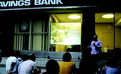 当然,无论如何,曼哈顿下城区仍然是所有这些活动的轴心。但这个艺术主阵地的地位一直处于重新商榷和审核之中;比如,今年下东城的位置进一步巩固——迎来了若干大型艺术机构进驻,包括包厘街(Bowery)的新新美术馆(New Museum)和好几家当代艺术画廊,与此同时,更广泛的纽约城区则似乎已完全饱和(寻找纽约“下一个”波希米亚街区的前沿逻辑已成往事)。实际上,以上情况构成了“公共房间”调查研究的具体题目之一。“公共房间”是Lars Fischer, Maria Ibañez de Sendadiano和Todd Rouhe于2006年成立的一个建筑小组,他们的工作地点位于格兰街(Grand Street)东口的移民银行大厦——一幢不起眼的现代主义风格建筑。如今已成为“事务所”的“公共房间”小组最初不过是几个独立建筑师共同分享的一个工作室。但成立后不久,Fischer, Ibañez和Rouhe便开始合作做项目,其中大部分的研究重点都放在不同历史时期社会团体如何进入并适应实体建筑;以及另一个同样重要的问题:我们可以如何重塑这些实体建筑结构,使它们更好地为其中不断变化的社群服务。(举例来说,想想我们对“工作”的界定经历了怎样的变化——从固定单位,定时上班延伸到口袋里的黑莓手机和一天结束后的社交晚宴——再想想我们的行为模式发生了哪些转变以及由此对我们所在的建筑提出了哪些不同要求。)很快,三人的行动令公共大厅艺术的发展方向有了新的逆转。他们选中移民银行大厦的门厅——最自然不过的公共空间,为一家银行,两间老人院和一个儿童发展项目机构共同享有——在那里开展了一系列极富挑衅性的活动,对共同体这个概念本身进行了一系列分析和考量。