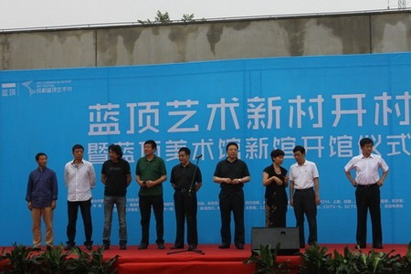 下午2点半,蓝顶艺术新村开村暨新美术馆开馆仪式在蓝顶艺术新村新美术馆广场上演。首先展开的是新村开幕前行为艺术《庆典》暖场,由行为艺术和现代舞组成,7位来自成渝两地的年轻行为艺术家的参与让我们感受到蓝顶的学术活力与开放姿态,而12位现代舞者中,有9位是年龄从14岁到22岁的智障儿童,来自重庆慧灵特殊学校,是著名舞蹈家荣涛老师长期关注和支教培养的学生,他们的参与,将让我们在欣赏艺术的同时,更感受人间大爱之美,感受到生命的尊严与活力,它呼应着蓝顶艺术区长期担当的社会文化与精神建设的责任感,体现着蓝顶艺术家一贯自觉承载于心的社会公益良知。现场行为持续有20分钟之久,紧接着各方嘉宾相继发言后,艺术新村开村仪式正式开启。