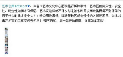 艺术仓库网站微博质问道:“艺术区的持久性,安全性,稳定性如何才有保证,艺术家这样朝不保夕总是被各种开发商欺骗而得不到保障的日子什么时候才是个头?!听说周边黑桥,环铁等地区都会慢慢纳入拆迁项目,如此以来艺术家们工作室何去何从?”周五通知,周一就开始砸墙,办事如此高效”。