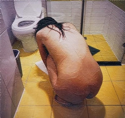 李博的作品很难归类,既以私摄影为基础,又以画布为载体,画面上又以绳子作为肌理表现出强烈的视觉冲击力。