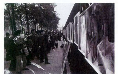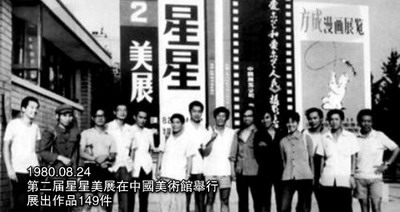1979年观众在中国美术馆外观看《星星美展》。1979年9月27日,中国美术馆出现了奇怪一幕。馆内正在展出《建国三十周年全国美展》,馆外公园的铁栅栏上,却起起伏伏地挂满了奇怪的油画、水墨画、木刻和木雕。这些怪东西吸引了不少路过或打算进馆看展览的观众。 [1]