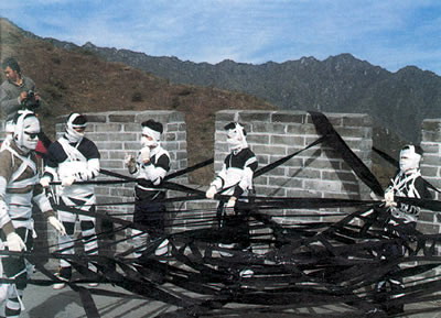 这场综合了戏曲、音乐、美术、讲演的戏剧性活动在很大程度上具有发泄性质,它与这之后不久举行的中国现代艺术展中出现的种种行为活动形成了一种必然的呼应。其中具有受虐性的捆扎与纹身的表演再次重复了’85思潮以来的行为艺术。只是,当编导把这样行为艺术艺更大规模放在一个非常具有象征意义的环境 – 长城 – 时,行为艺术本身的社会性、批判性的特征就表现得更为充分。当然组织拍摄这次活动是具有自悦性的。然而这种自悦性使我们感到了一种沉重的氛围。这在其中的一首摇滚乐歌词中以文字的形式传达了出来: