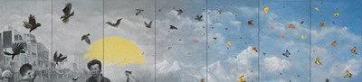 在2008春天,方力钧完成了他2004年以来进入一个相对稳定的思考状态时的有着重要意义的作品《2008年?春》;展览也多从这张图像中受到启发:不是因为它是关于逝去的、革命的、暴力的,灾难的、让人怀疑或者相信的世界、人或者动物的生命、被赐以丰饶之福而不是咒以匮乏之苦的生活,在一个突发的变迁面前多么不堪一击;而是,我们发现,历史的“沉沙折戟”处是艺术家构思的开端。艺术家注意到这个开端,也试图创造出一个不同于以往书写的开端,对于方力钧,这个开端勾连着称之为痕迹的、废墟般的广阔性而具有了未来考古的意义,任何现实在一个开端面前总是显得那么脆弱——这件作品成为我们观察方力钧最近几年创作的契机之处,在此,如此思考生命形态和历史走向,使他的时代诊断完全脱出指向了社会历史背景的批判,问题在这里变得抽象并使思考进入具有历史观的追问。在这个成熟的思考位置,人的问题被抽离出一般处境的焦虑,这个过程首先经由艺术家将关注点置于动物上开始――2006年、2007年,方力钧创作了大量的关于“飞翔”的作品,鸟、昆虫、鱼、野兽、的飞翔。这种位置,不是简单地将人置身于人的历史,而是置于与不可知的一切的关照中,将人置于不可抗拒性中。这种思考的位置,使作品具有凝重力量,开始了一种成熟之境——我们在此看到的艺术家已经不再绝对地相信自己是自由的当局者了,或者是自身所作所为的始作俑者——正如,在1980年代末,方力钧开始制造具有充满想象力的时代性画面来烛照当时的历史现场的复杂性和暧昧气氛——面对当时那样一个强大的昔日集体主义理想的崩溃,方力钧试图驱散目的论者对时代幻觉的虔信,让“我们”面对当下现实,他用一种创造性的途径来防止跌入混乱逻辑的陷阱,“光头”和“时代的哈欠”都代表了一种主动的姿态。而“沉沙折戟”处是真正的写作之处——在自我之外,在另一个位置上,写作具有了意义:艺术家从历史深初的回响处,从更恢弘的视线中看到了现实——我们注意到,这与方力钧近几年的思考和艺术实践相关。