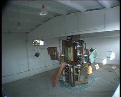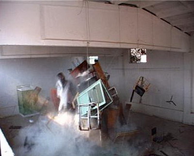 方案:从二手市场购置各种旧家具,大衣柜,床,书架,沙发,写字台,门,窗,椅子等等,简陋的,家常的,布满指纹和主人的气味,没有设计趣味只有简单的使用功能,曾出现在所有人生活中的标准样式。把它们悬挂,堆积在房间内,在其中安置火药炸点,瞬间引爆。爆炸是我头脑中挥之不去的念头,最终这种小小的毁灭感应该降临到我们身体上,我邀请所有参展艺术家共同引爆身上的炸点,体会在身体上虚拟的破坏力。(邱志杰因当时在国外未能到场)