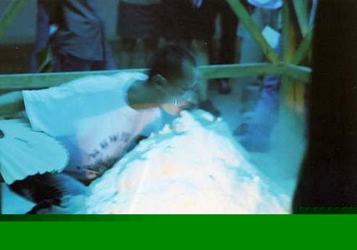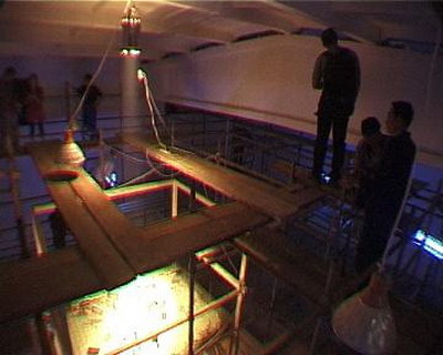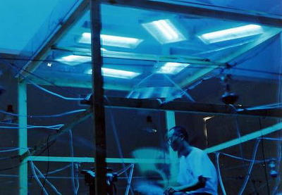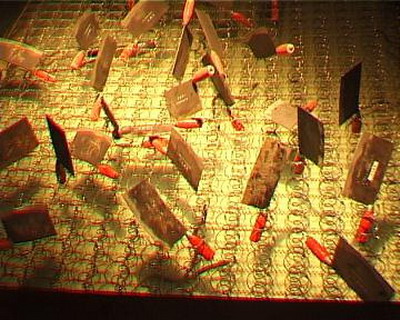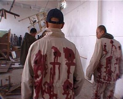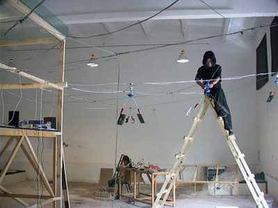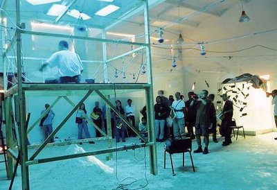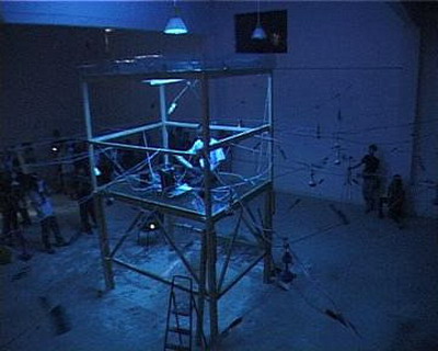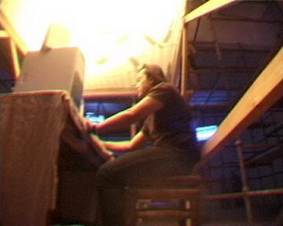 下午3点半展出就要开始了,我发现灯光不够迷幻,但什么都来不及了,我的前期工作做的太差了,这时突然电没了--跳闸了!我的工人开始检查电路,原来是插线板湿了,换!一会儿就好了,一切都恢复正常了,但没过几分钟又跳闸了,这时振华正在刻盘,经过两次跳闸后,他快疯了!他要把电脑卖给我,我向他保证不会了,这时已是2点半了,又换过电线后,线路正常了。我们坦然的去吃饭,留下一个工人清理场地,吃到一半,工人跑过来说他触电了,又跳闸了,我有了重大的发现,原来邱志杰上次的菜刀和钢丝上都带电,他的作品太棒了!现在唯一的办法就是换掉所有的电线和钢丝,这时场地里一片混乱,观众已在门口等了!幸亏这些人手快,3点半,我像导演一样说:开始!一个表演者一脚把电脑的电源线踢掉了!当电源重新接好时,游戏的文件被损坏,只有声音没有图像!王郁洋空坐在电脑前。展览开始了,我发现振华在哭泣,他的电脑…………