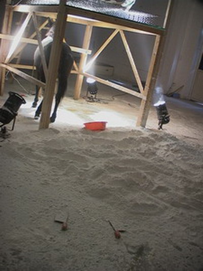 振华建议可以直接利用刘韡的木架,他本来是要用它拍一个影像作品的,但一直放着没用。刘韡跑来察看一番,在我再三保证不会损毁木架及玻璃的前提下他答应下来,这个木架便成了刘韡提供给我的材料。邱志杰的十袋面粉这时已堆在现场。下面的工作是改造及加固木架,这时候我已确定第二层玻璃上放一头骡子,我想这会非常荒诞。