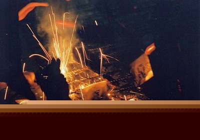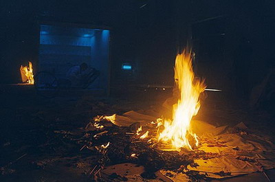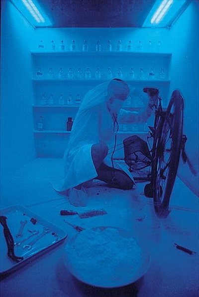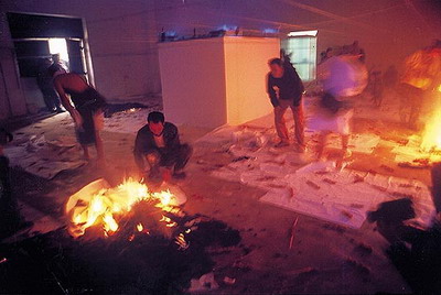 下午三点,场子里口水歌迪曲响起--展出开始了——大家一进来先聚在诊所那里,在紫光灯的照耀下,小郑在里面带着听诊器煞有介事地修车,我和张慧骑着自行车,穿着白大褂,戴着手套、脚套,背着皮包--里面放着孜然和辣椒面--拿着酒精灯烤铁网上的肉串,王琛1米9的大个子端着医用白瓷盘:上面放着葡萄酒和高脚杯,腰弯得像个大虾米;张慧也个子大,骑着28的大车子,一路碰掉不少肉串,索性就下来烤,邱志杰就在边上等着烤熟了吃。一股糊味传来,扭头一看,地面的宣纸已被点燃,好多观众也参与进来,屋里弥漫着白烟和呛鼻的味道,把微不足道的肉香掩盖住--观众被挤出场地。