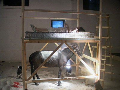 同意你的一些看法,我自己认为那件作品主要的问题是表演和装置部分关系上有一些脱节。直接原因是原来要把骡子放在第二层,但突然发现这一想法因为骡子的极度恐高而只好临时取消,而把它放在地上就太正常了。而鳝鱼由于没有利用变成了一种摆设。泼水和整骡子更多是以偶然及偶发的因素在作品中出现,我认为这本身是一种报应。