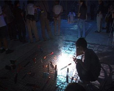 张慧的车带着50斤羊肉和三个烤肉串的烤箱来了,我们坐在车上连脚都伸不直,到了芥子园,把附近的几个小饭馆的服务员都叫来,加上工人一共十三人。振华屋里的灯一直是坏的,只能打开台灯——昏暗的灯光下所有人分成两大组穿肉串,两个小时后,面前像小山一样堆起,又把附近所有小买店的冰柜都包下来储存肉串,生怕明天肉变质--那就白忙活了。