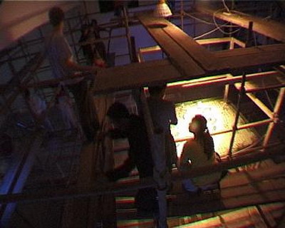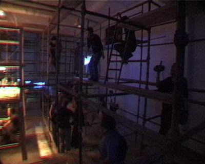 回到芥子园稍作休息就开始进场,场子里已经灌满了水,阴气十足,偏偏这时墙角监视器出了问题:先是刘韡摄像机的连线找不到,然后电视机也出了问题,忙活半天,换了一台,摄像机又没电了;外面的观众陆续来了,都被振华堵在外面,没时间了,赶紧爬上架子,郑云翰和他的女朋友上来上帮我们绑线,台上四个人,外加一个液化气罐,直担心下面玻璃架子承受不了;小闽在周围爬上爬下,已进入角色。