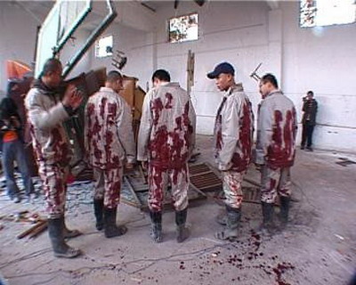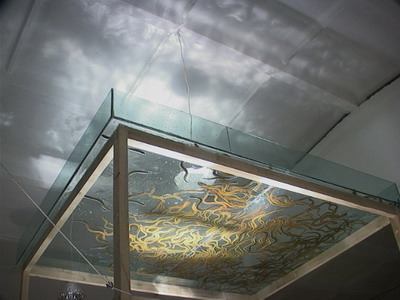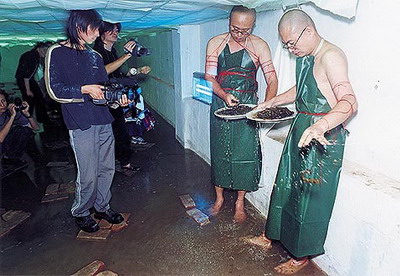 四点,张慧用步话机通知振华展览开始。不一会儿看见人头一个个从顶棚下面钻出,现场的水气侵上来,清新气爽,周围一切变得透明些,身体飘而放松,突然一个念头:吸毒是不是就是这种感觉?蟮鱼被肢解成一段段,在面粉里扭曲打滚,血渐渐晕开,把玻璃架子里的水染红,张慧那边传来阵阵油烟和吱喇吱喇的声响,我不时帮他割断身上的红线,娃娃砸破宣纸,裹着铺在上面的面粉落到水里或落在观众身上。大概一刻钟,我们各端着一盘鳝段下梯子到喷头位置下,就在水冲破顶棚时,双方交换一下眼色,即兴洗起蟮段,投入水中。