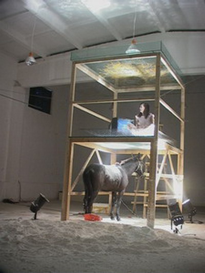 刘韡木架上的玻璃非常坚实,一个人在上面蹦一点问题没有,可我心理隐隐约约的还是担心它是否能撑得住一头骡子,而这种对于危险的担心持续地存在,渐渐的对于危险性的表达变成了作品的一个方向。