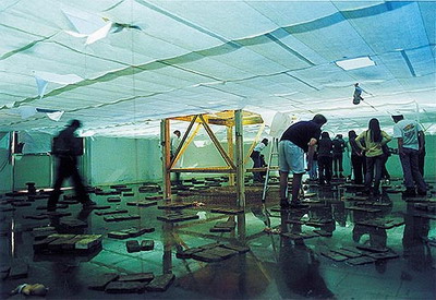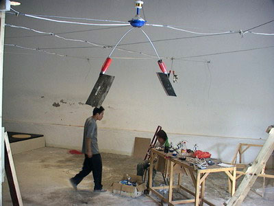 今天的主要任务是铺顶,几个学生又过来帮忙,我们吸取教训:先用双面胶把宣纸纵向粘好--13米一长条,再放在绷好的铁网上--效果即快又好,一算价钱需要上千元,心里就一沉。好在冷静下来重新算了一遍,才知上回算错了,心中大喜。下午效率果然高多了,李师傅在预定的位置装好喷头,也下来帮忙,很快240平米的展厅铺满了,抬头一看,白茫茫一片,心里一下就踏实多了。接下来在里面工作太麻烦--必须弯着腰,尤其张慧个子高一点,干一会儿,就要出去直一下腰。顺便抽枝烟,喝杯啤酒。
