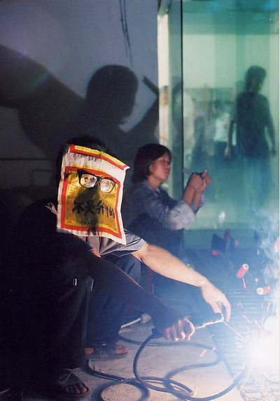 石青留下的钢丝床,在我看到工人焊吊扇时的弧光就知道该怎么用了。让他们在现场接着焊,关键要出声出光,形成第二中心,打破蛛网结构的向心性。“后感性”强调“场”,就是要避免一个中心太强,得让作品泡着人,别让人围着看。再说我们这帮人热衷于改变行为艺术中艺术家本人独角戏的状态,让别人做是对的。焊什么呢?菜刀嘛,明天再买它四十把就行了。这灵感其实是来自民工的创造,他们省钱没买面罩,找张纸掏两个洞套上平光眼镜就对付了,结果非常有戏剧性,像傩戏。纸上还可以做文章。唯一要考虑的是竖着来还是铺在地面焊,竖着来可以影响穿过玻璃门入场的观者…