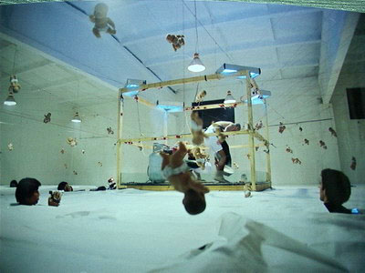 回来展场又出了问题:李师傅在拉悬挂铁丝时发现十几个娃娃挂在一根铁丝实在太重了,大家只好又把娃娃里的沙子再倒出来,然后在每个娃娃的不同部位系上红线,再穿过悬挂铁丝的孔眼,把娃娃拉起来,线另一端系在中央的木架子上。现场无声地忙碌着,到了11点才开始糊顶。方法不对,进展很慢,我把张慧叫出来商量:明天展览肯定来不及了,太多的事情没有做。张慧在和李振华通电话,决定把展览日期改在星期一。