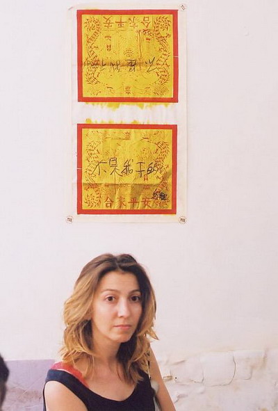 晚十一点,坐在浙美展厅的台阶上想着明天展览的事,正好张慧出来,就顺口问:“你北京的报应怎么样?”他坐下说要找一大堆老太太用宣纸糊棚,下面锅里煮菜刀。游戏规则里我在他之后,还要利用他的材料,我脱口而出:“你做(棚)下面,我就做(棚)上面,这样衔接有意思。”张慧也说:“我做地狱,你做天堂,人间就剩薄薄一层纸了。”说得兴奋,已忘了明天的布展,这时张慧馋酒的老毛病又犯了。