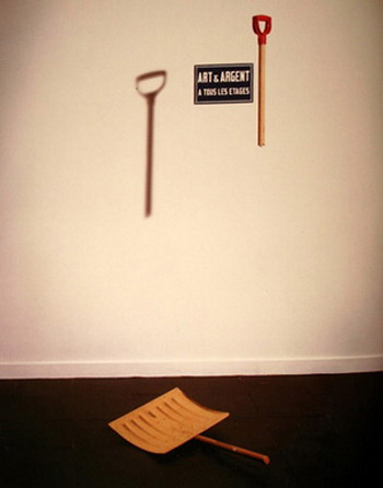 在19世纪80年代晚期,汉斯·哈克(Hans Haacke)的作品《Broken R.M…》以及《Baudrichard’s Ecstasy》中,杜尚的现成品受过渡的形式所支配,而这些过渡形式强调在艺术商品时代对现成品的不确定的使用:在后者中,一件镀金的小便池放置在一个熨衣板的上方;水从一个封闭的,自动的环形水桶中抽上来并流过这个小便池。在沃霍尔精明激增他的商品图像出现后,以及19世纪70年代挪用艺术对于“图片”的关注,19世纪80年代的商品艺术再次对物品关注,但是这次使用的物品中已经消解了杜尚时期标志与物体之间,使用物品与物品被赋予的意义之间的紧张关系;这些物品在被阐释的开始之初便被编排了,并通过相互作用下的神学冲动创造其价值。然而,哈伊姆·施泰纳巴赫(Haim Steinbach)的书架以极其优雅的方式证明了这一机制,它们停留在自己的束缚中。汉斯·哈克关于19世纪80年代商品艺术的客观性言论非常切合这些工具化现成品的艺术,而且作为一个整体,他的作品本身可以被看作是一种通过现成品的局限与后果的持续的尝试。